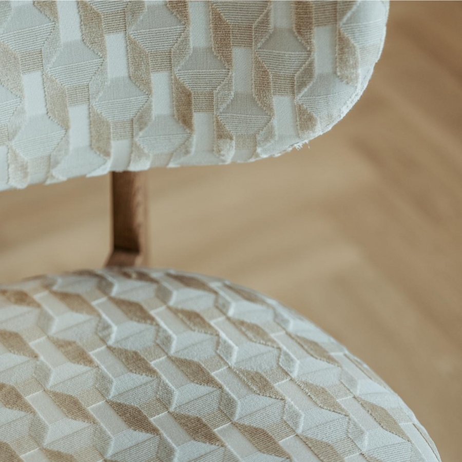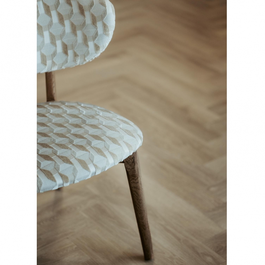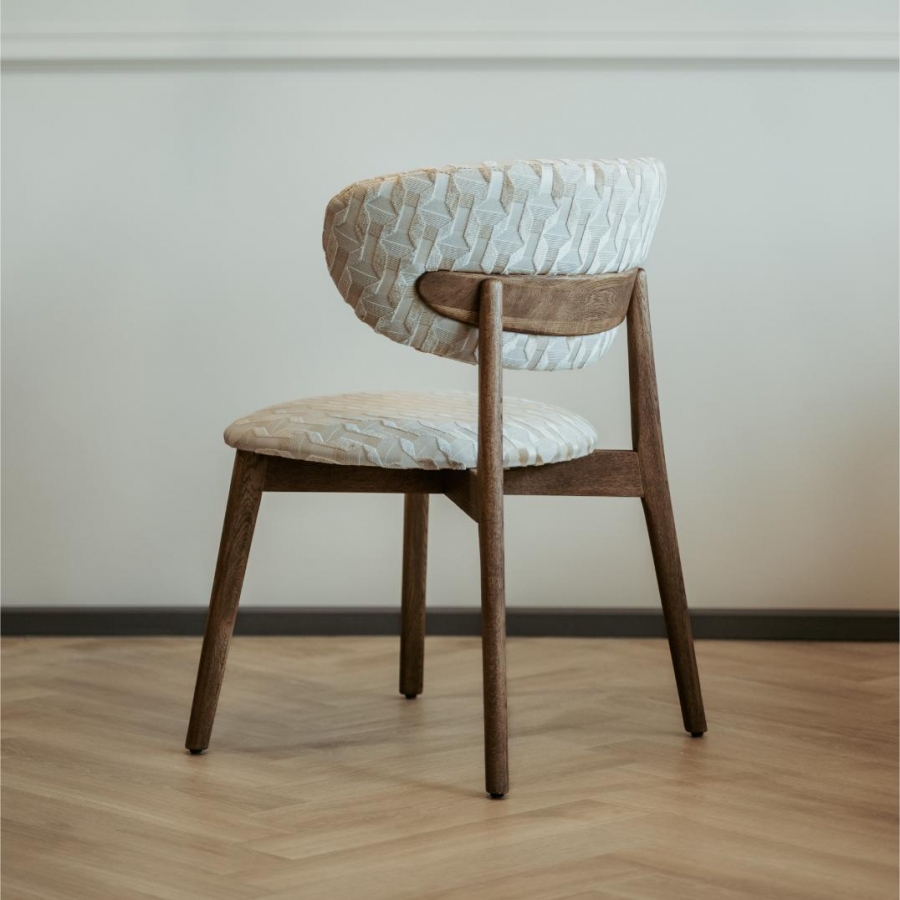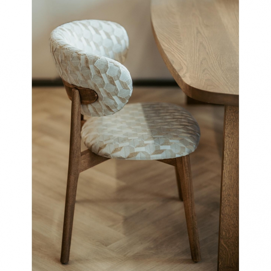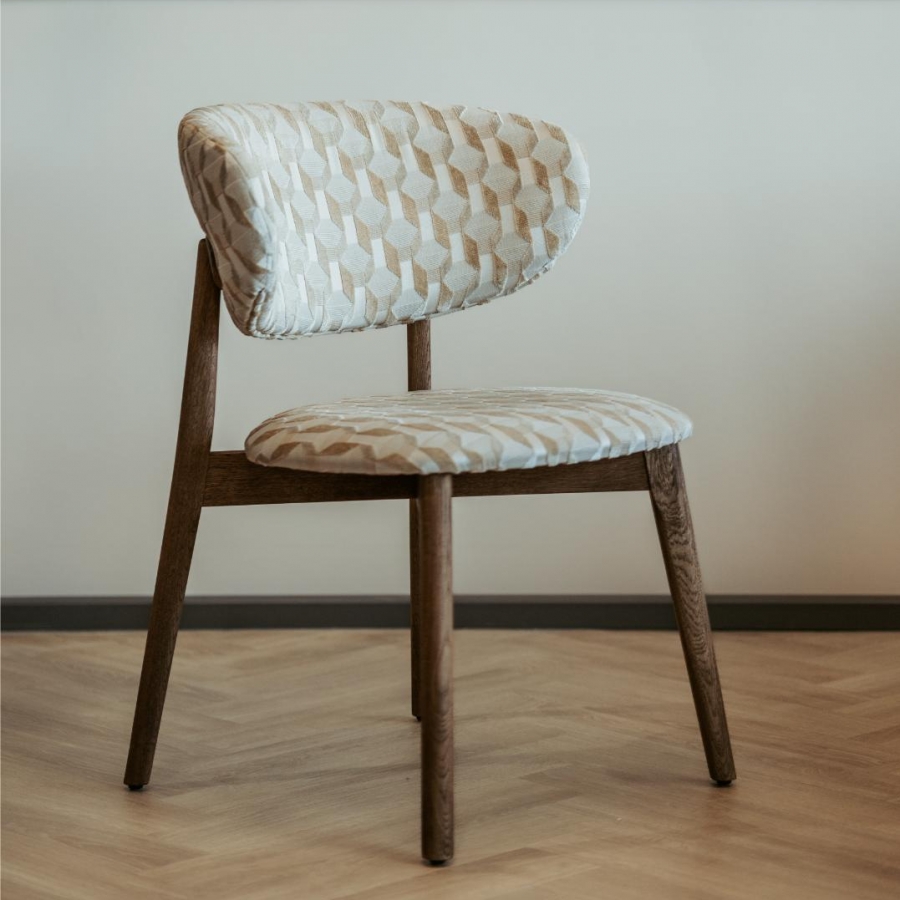 Op de foto is de houten eetstoel in een bruine walnootkleur te zien met patroonstof van designer Kirkby Design: Cubic Natural - K5304/04