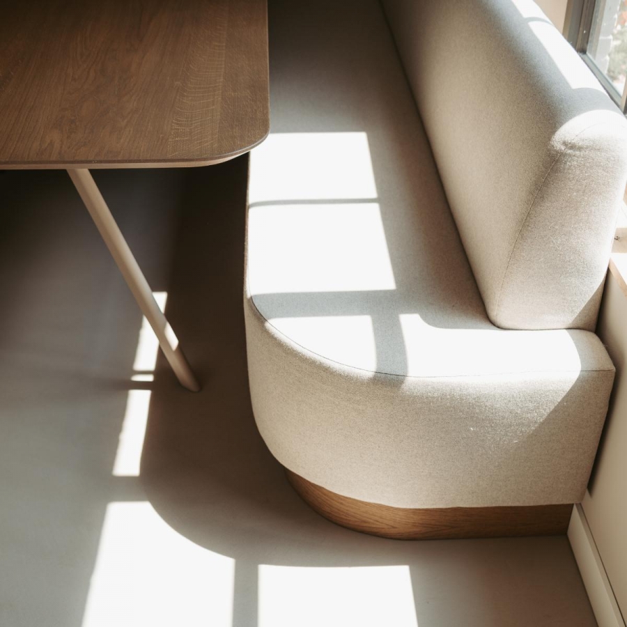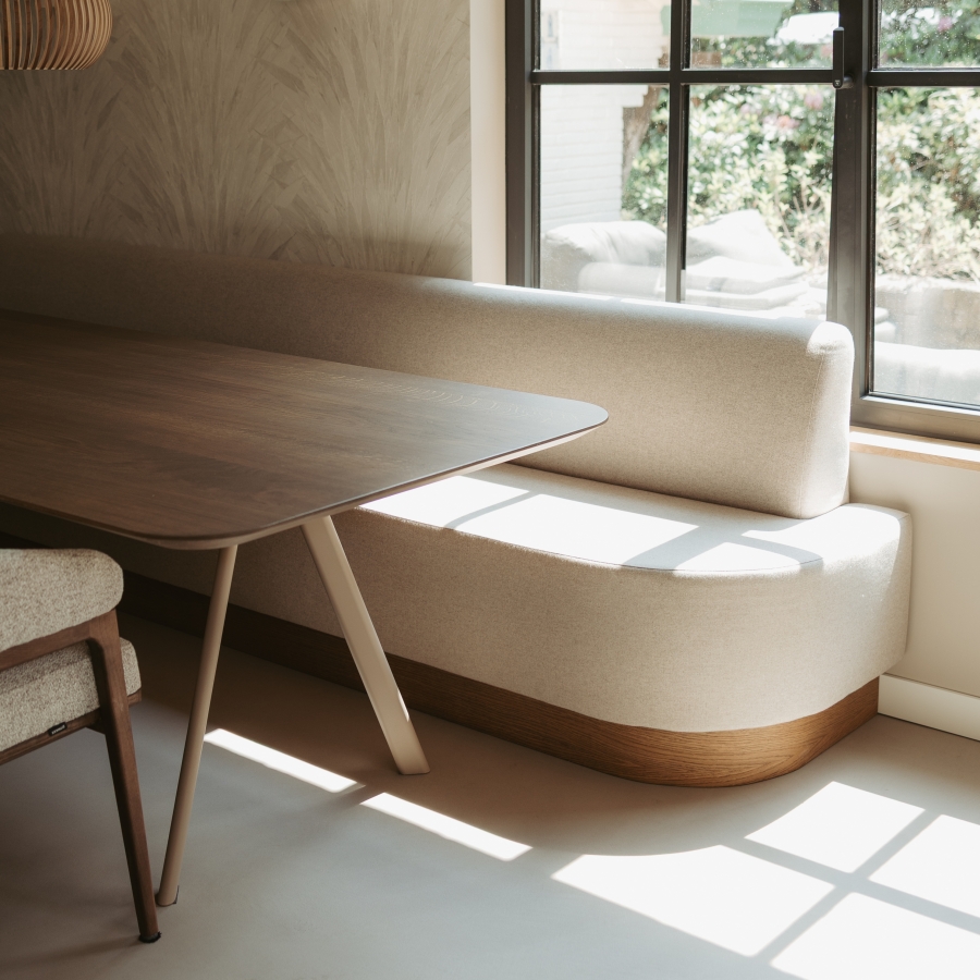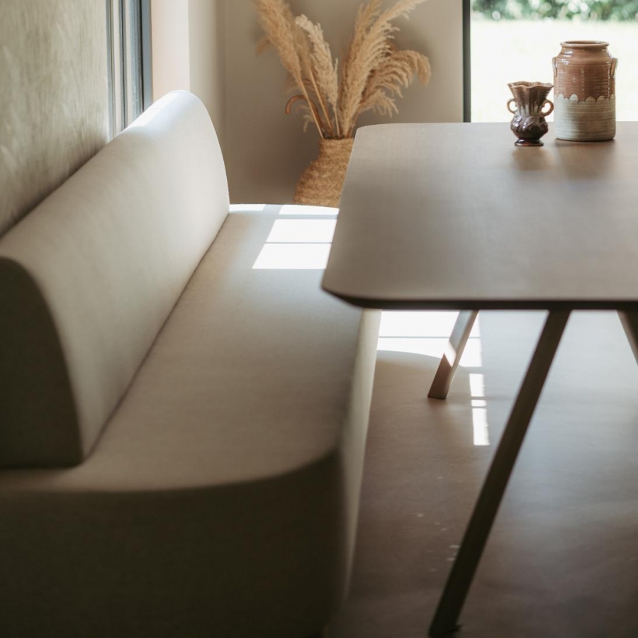 Prachtige eetbank met ronde hoeken. De zittingdelen hebben afgeronde uiteinden, en de rugdelen staan een stukje terug t.o.v. de lengte van de zitting, wat zorgt voor eigenheid van dinerbank Medusa.
