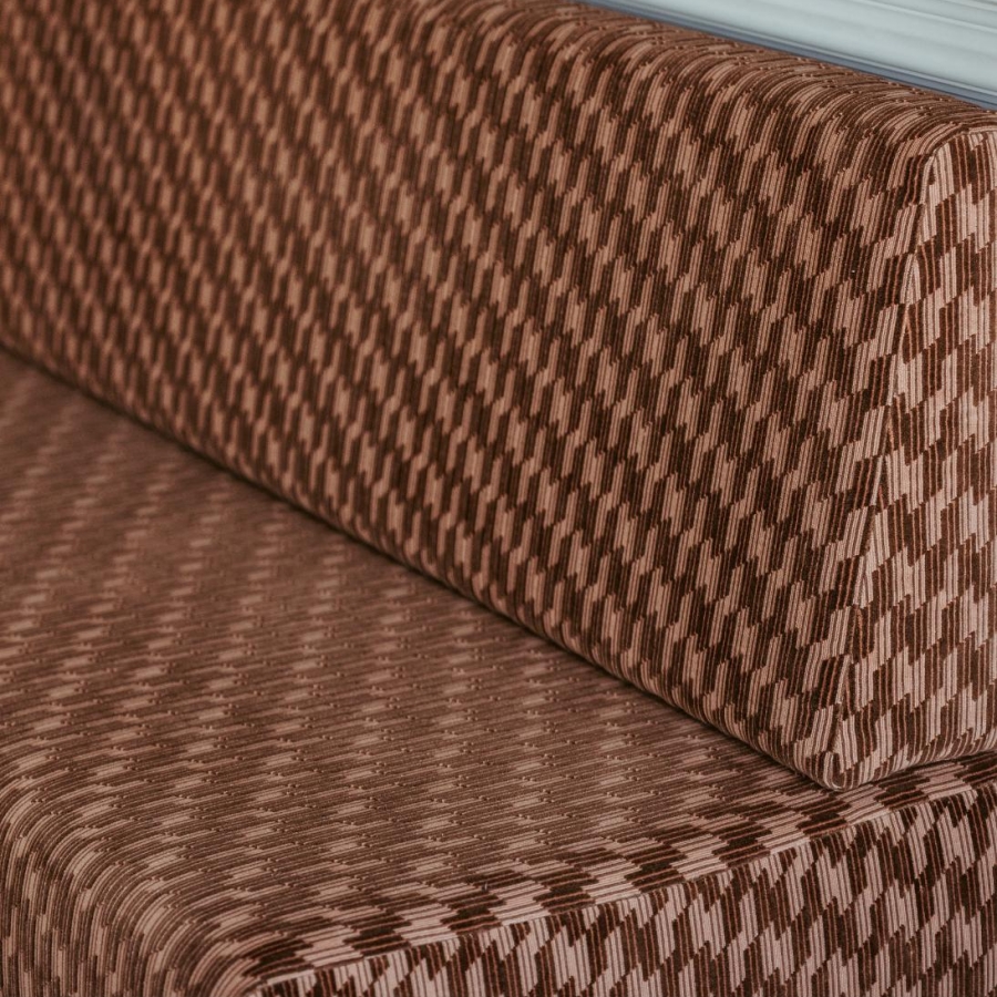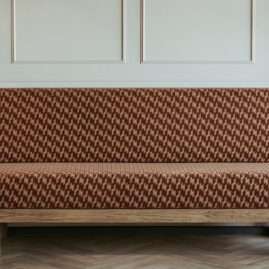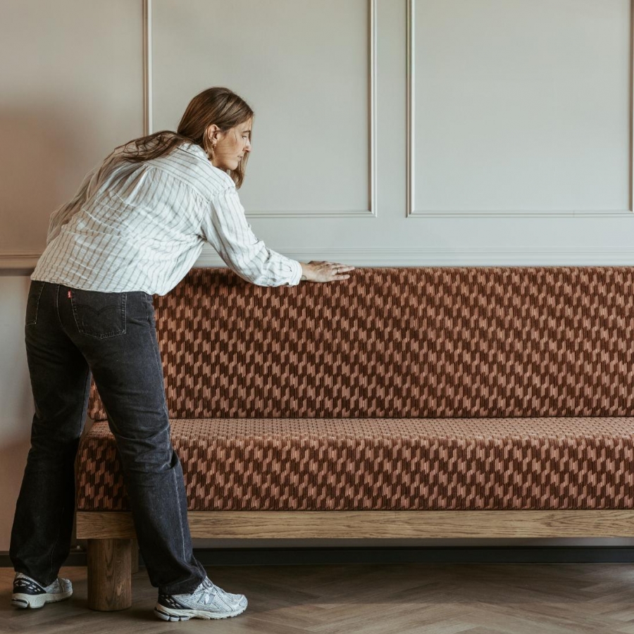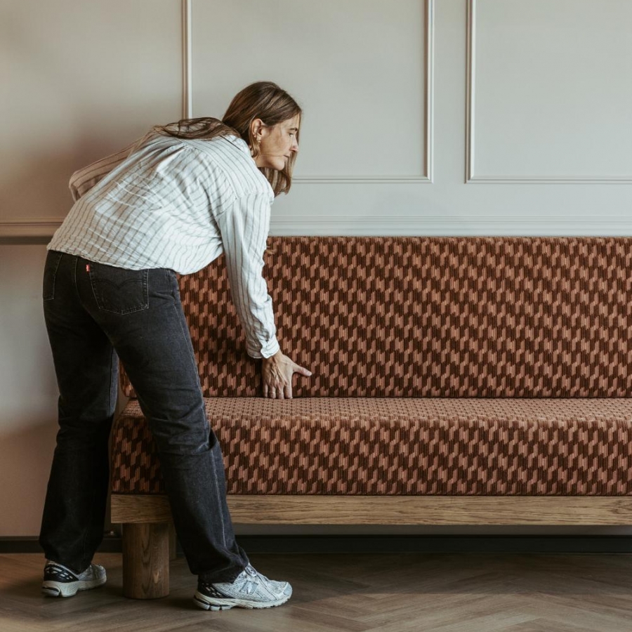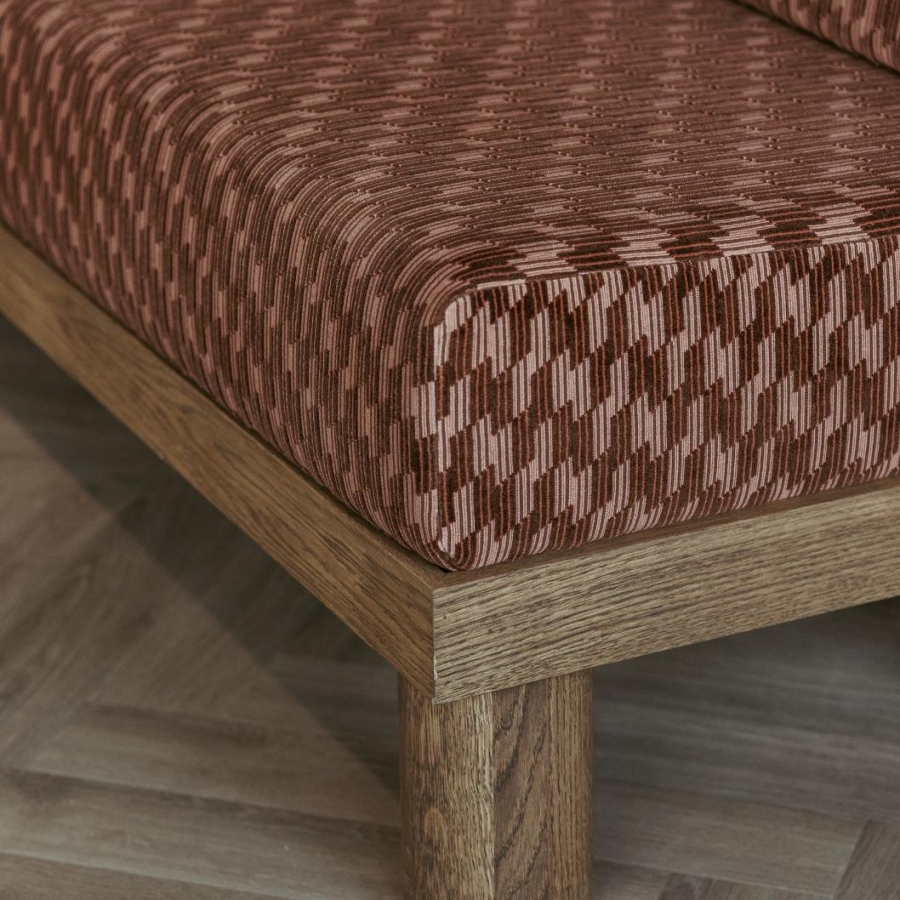 Dinerbank Partout geeft de perfecte harmonie tussen activiteit en comfort. De designer patroonstof van Kirkby Design in combinatie met het eikenhout straalt een natuurlijke sereniteit uit. De bank maken we op maat. We helpen je graag de perfecte maat in jouw interieur te bepalen.
