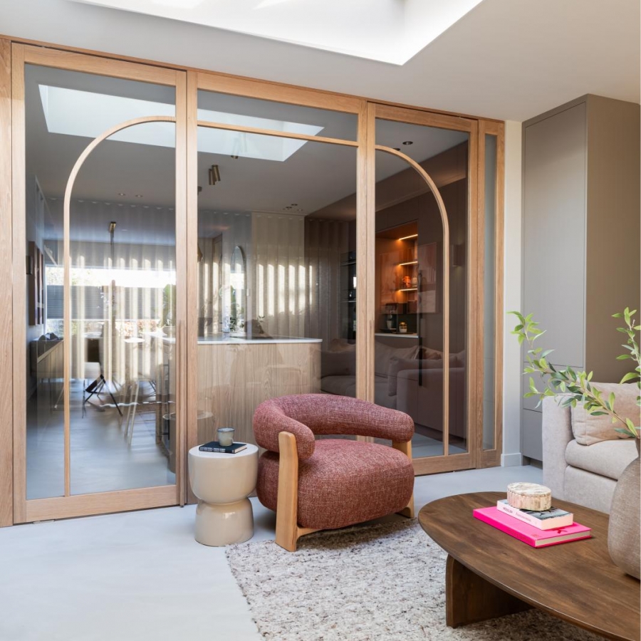 Door de roede ook door te laten lopen op het raam vormt dit samen met de deuren één geheel.