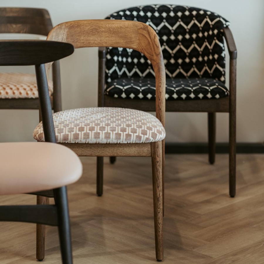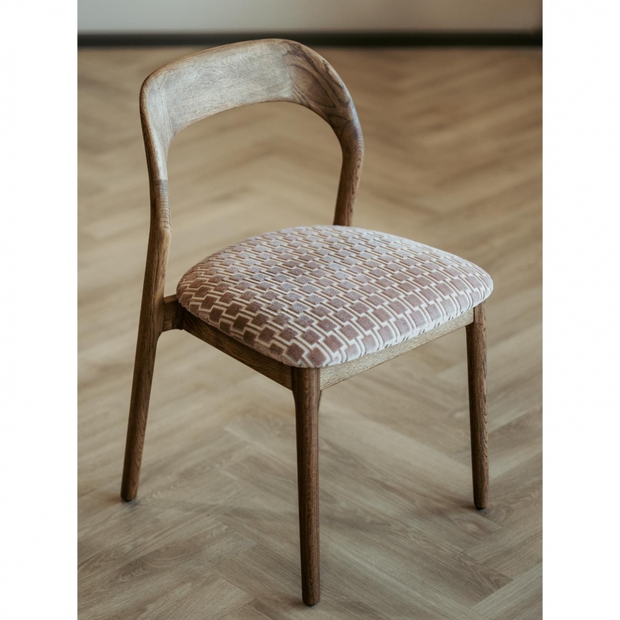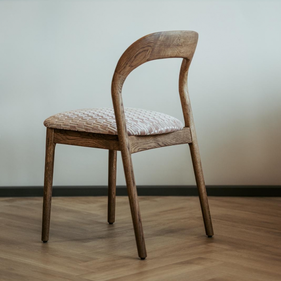 Eetkamerstoel Moly is een massief eiken stoel met een gestoffeerd zitgedeelte. De stoel kenmerkt zich door een modern en tijdloos design met charmante ronde vormen, en biedt veel comfort.