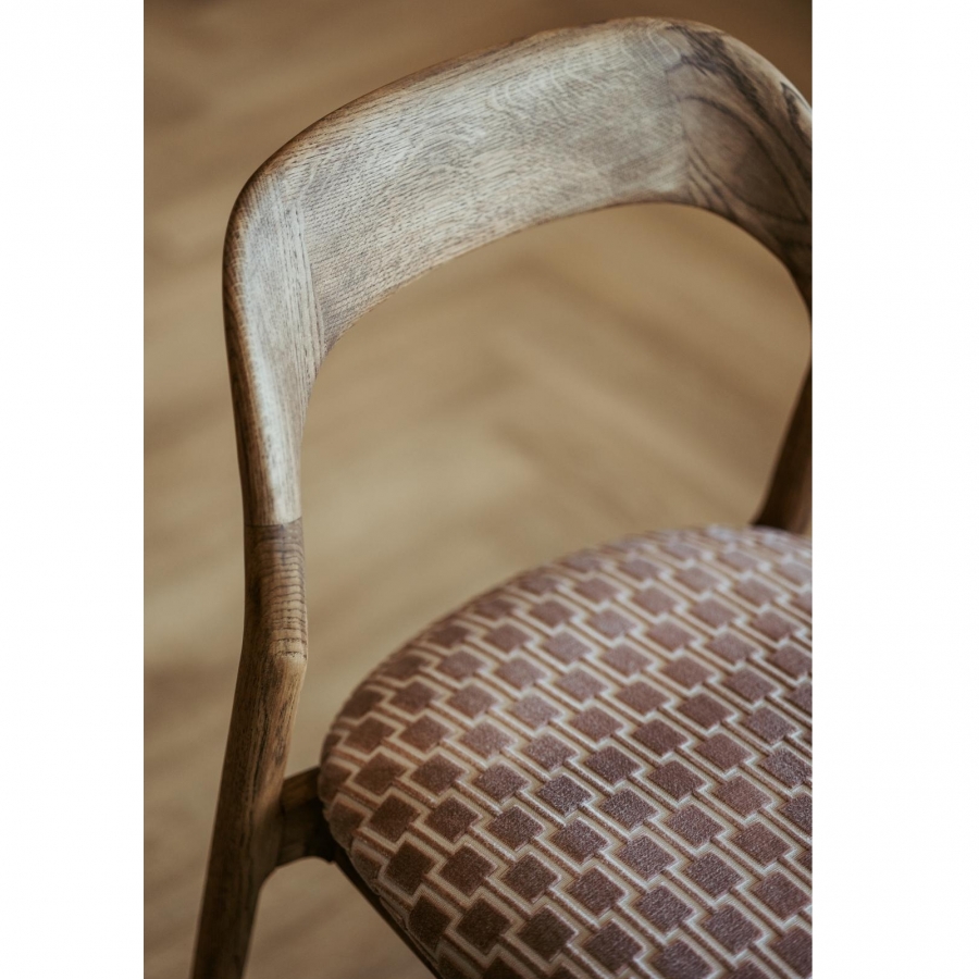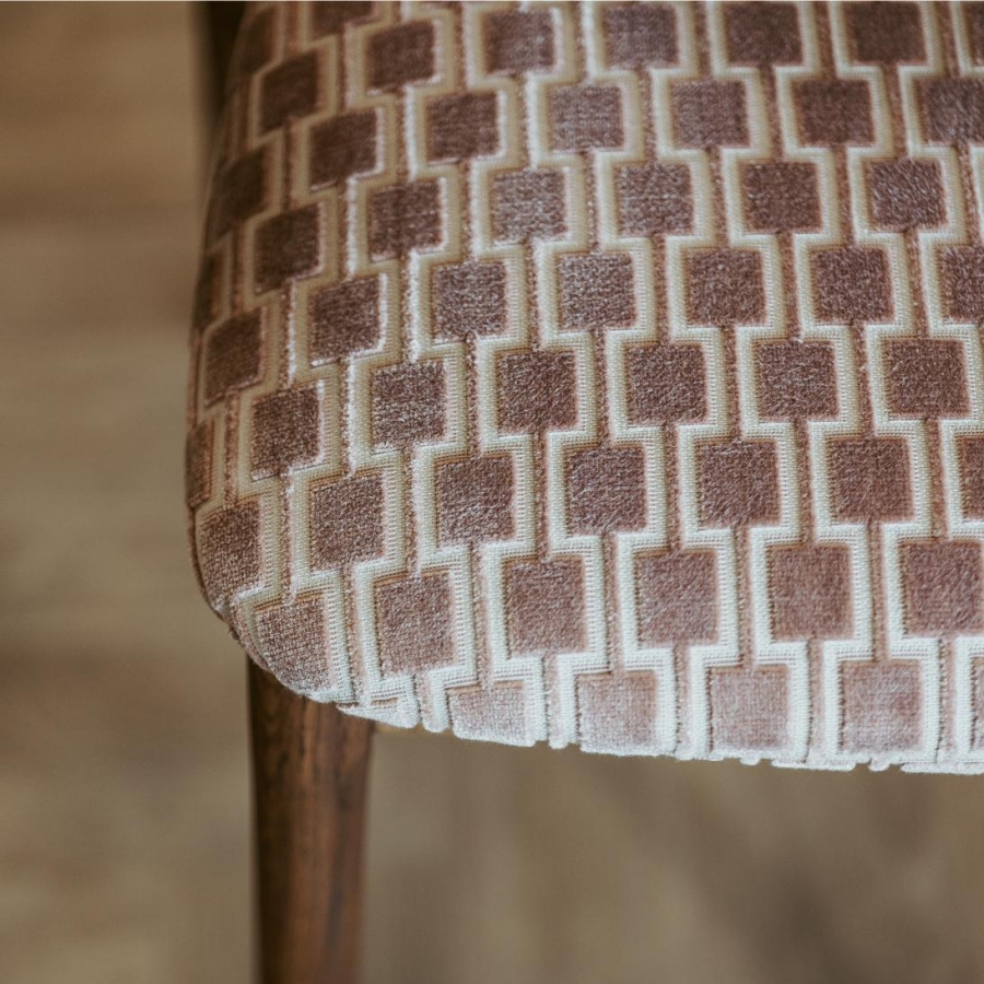 Op de foto is de houten eetstoel in een bruine walnootkleur te zien met patroonstof van designer Kirkby Design: Bakerloo Blossom - K5096/17