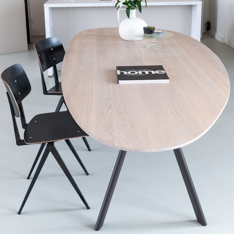 Waar stalen poten vaak voor een minimalistischer en strakker beeld zorgen, kunnen houten poten juist een heel warm beeld geven. Je kunt ervoor kiezen de poten goed in het zicht te zetten, maar je kunt ook kiezen om ze wat meer onder het blad te laten plaatsen, met de stoelen eromheen.
