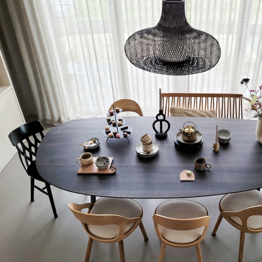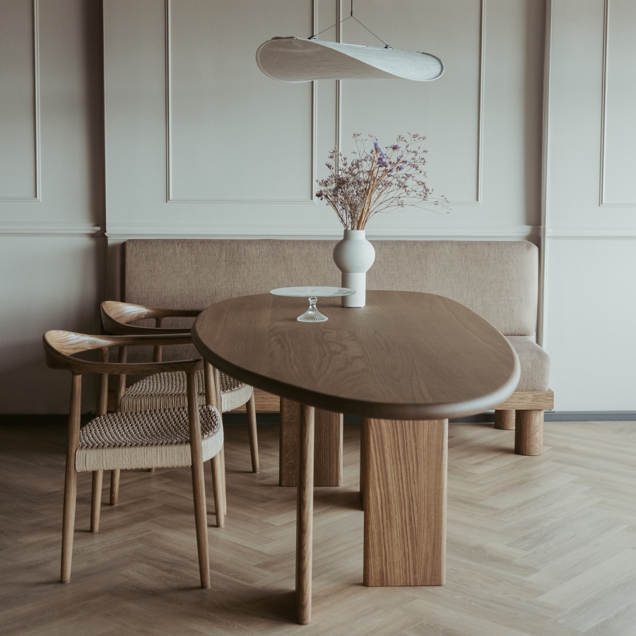 Een organisch gevormde eettafel, ook wel kiezelvorm of keivorm genoemd, brengt zachtheid in de ruimte en nodigt uit tot het gebruik ervan. Een eethoek wordt er vriendelijk van, en in veel gevallen breekt het heel mooi de rechte lijnen in een woning.