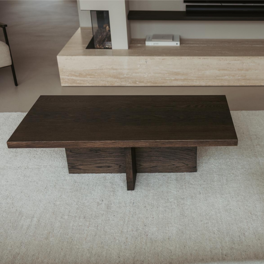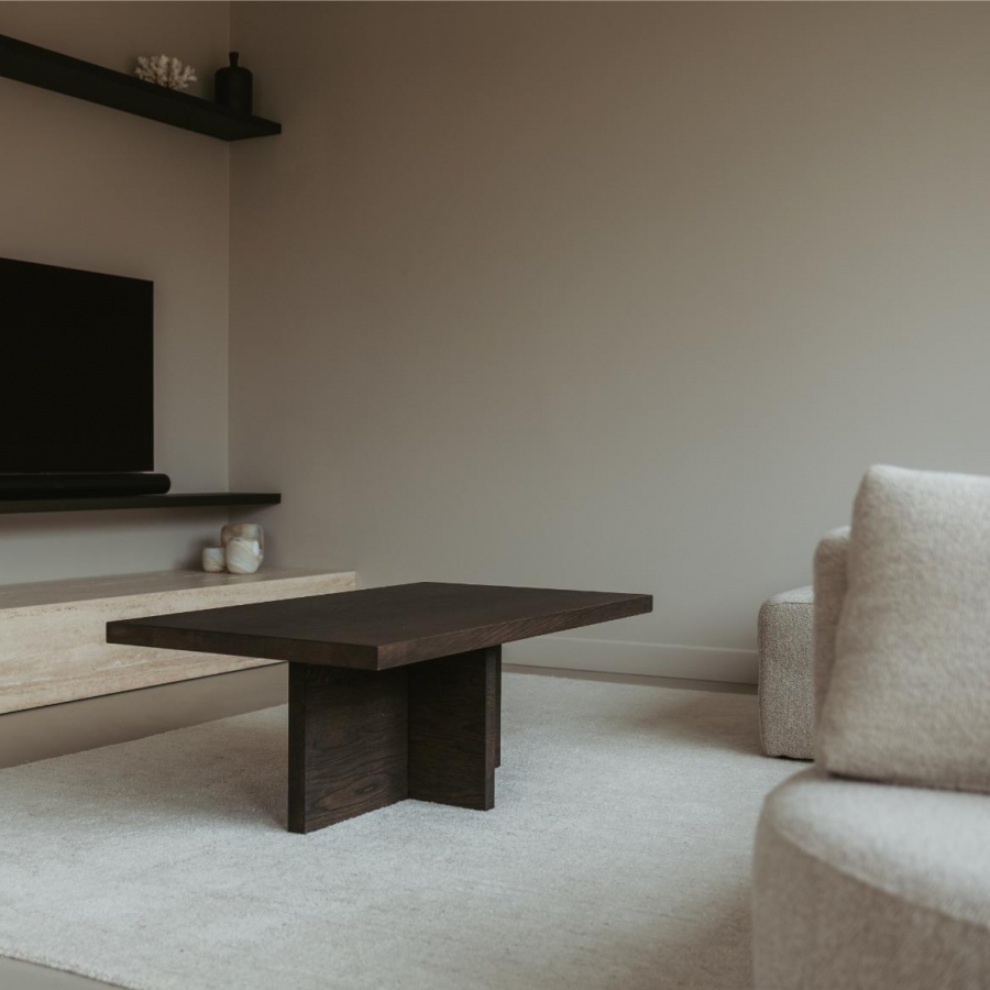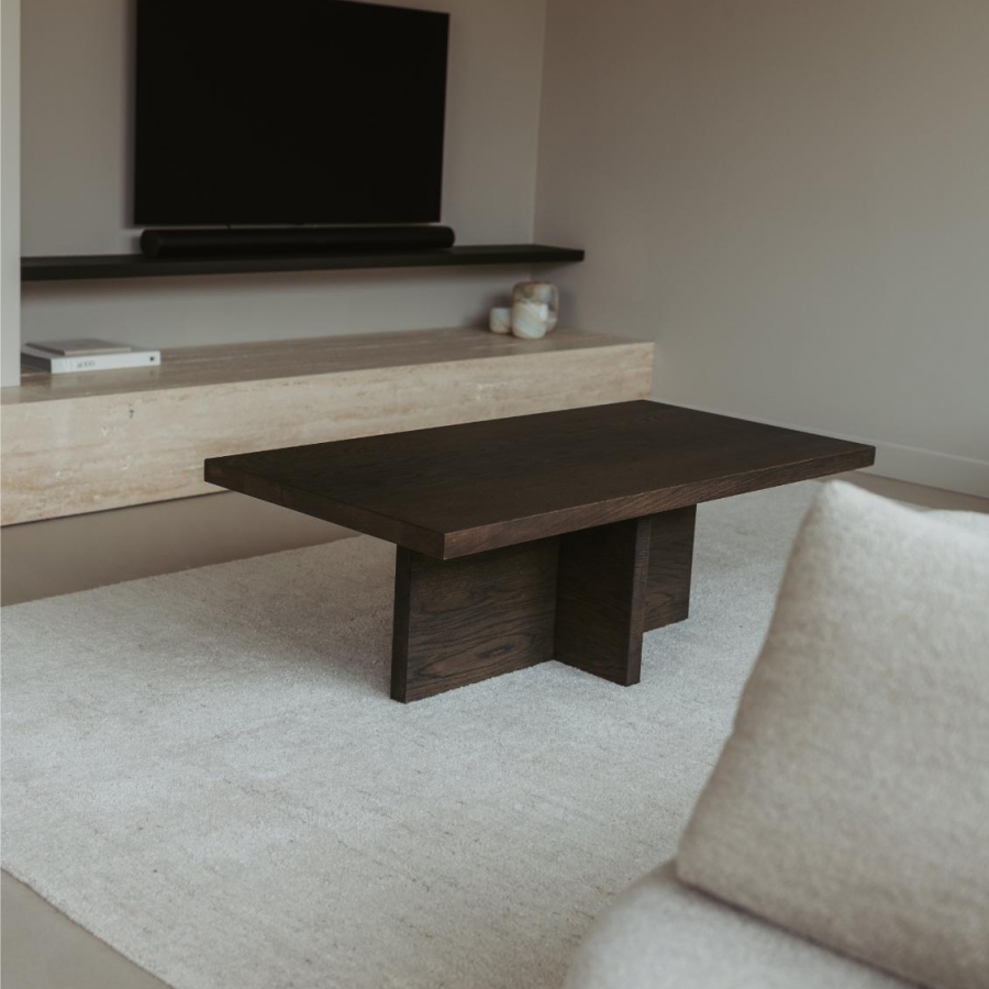 De rookbruine lakafwerking, de strakke lijnen en het kruisvormige, massieve onderstel geven de tafel een solide en uitgebalanceerde uitstraling die perfect past binnen een Japandi interieur.