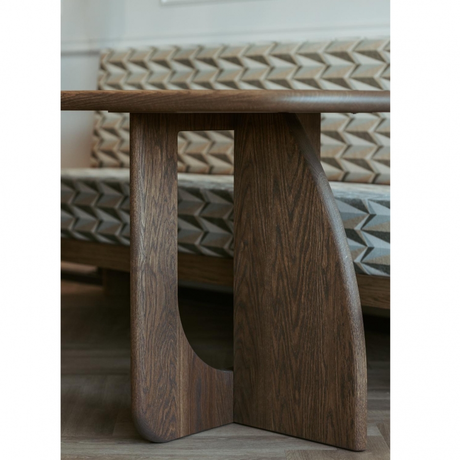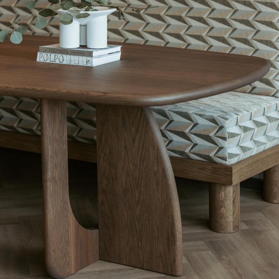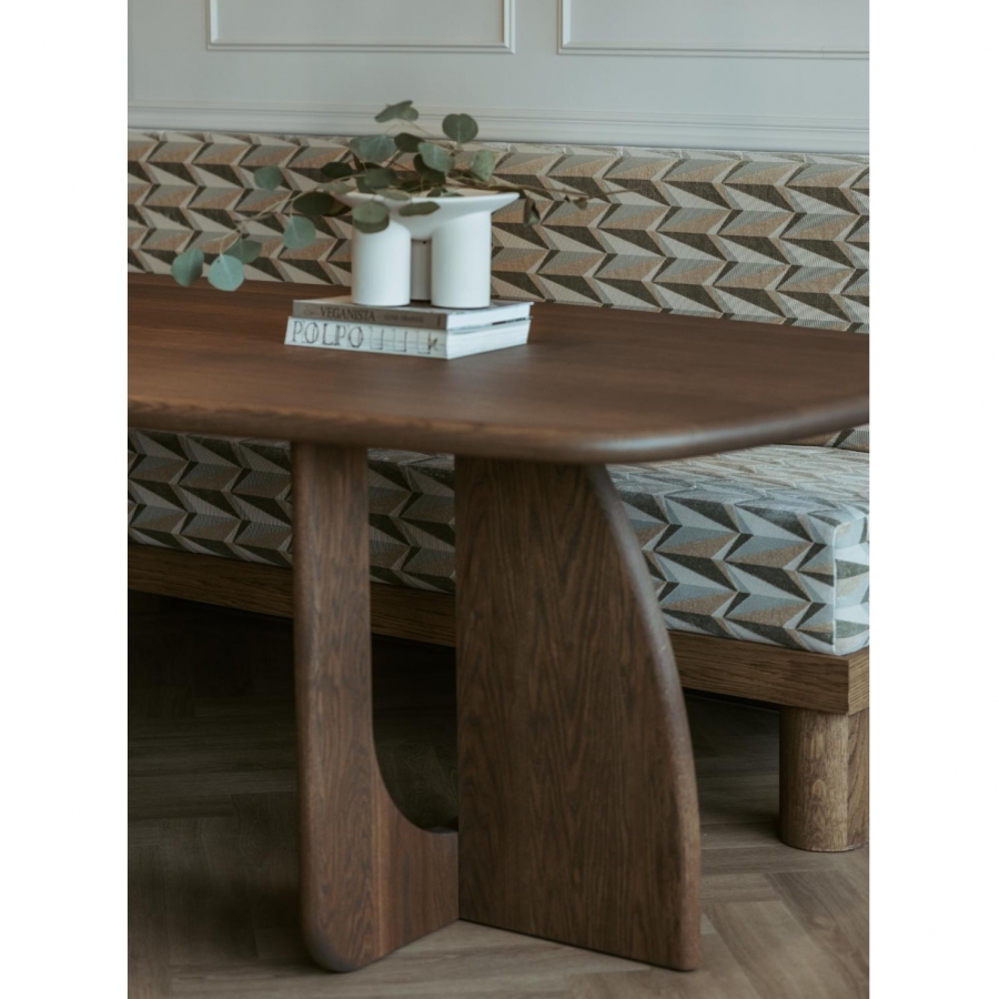 Deens ovale tafel van eiken met een ronde randafwerking uitgevoerd met twee massief houten poten in de kleur 'walnoot'.