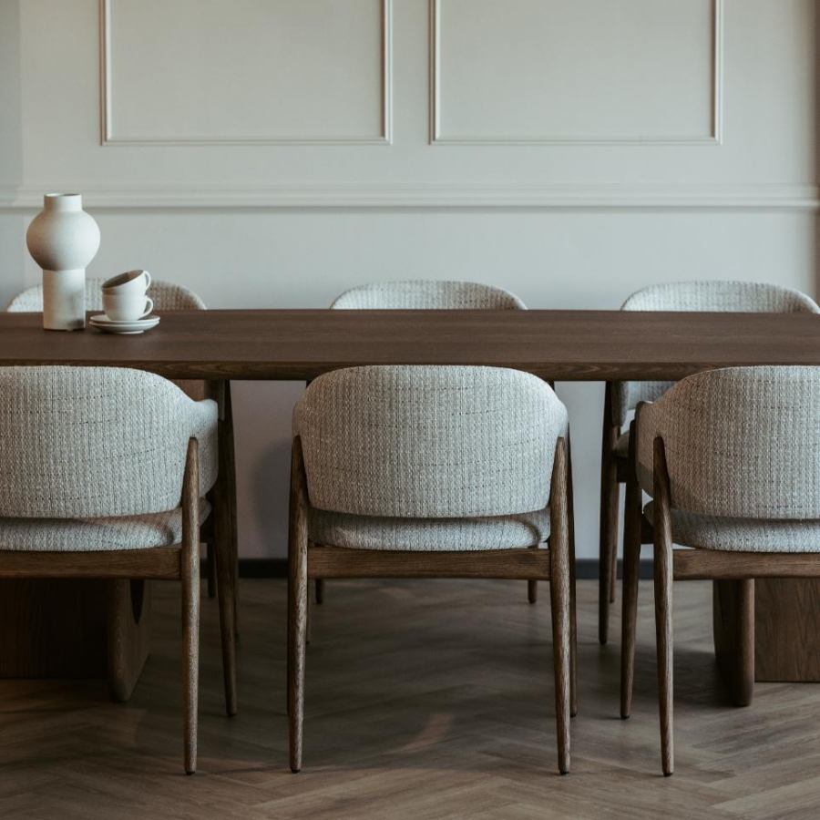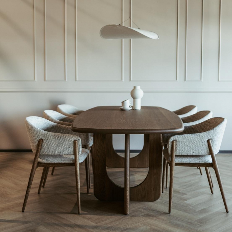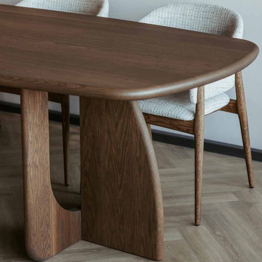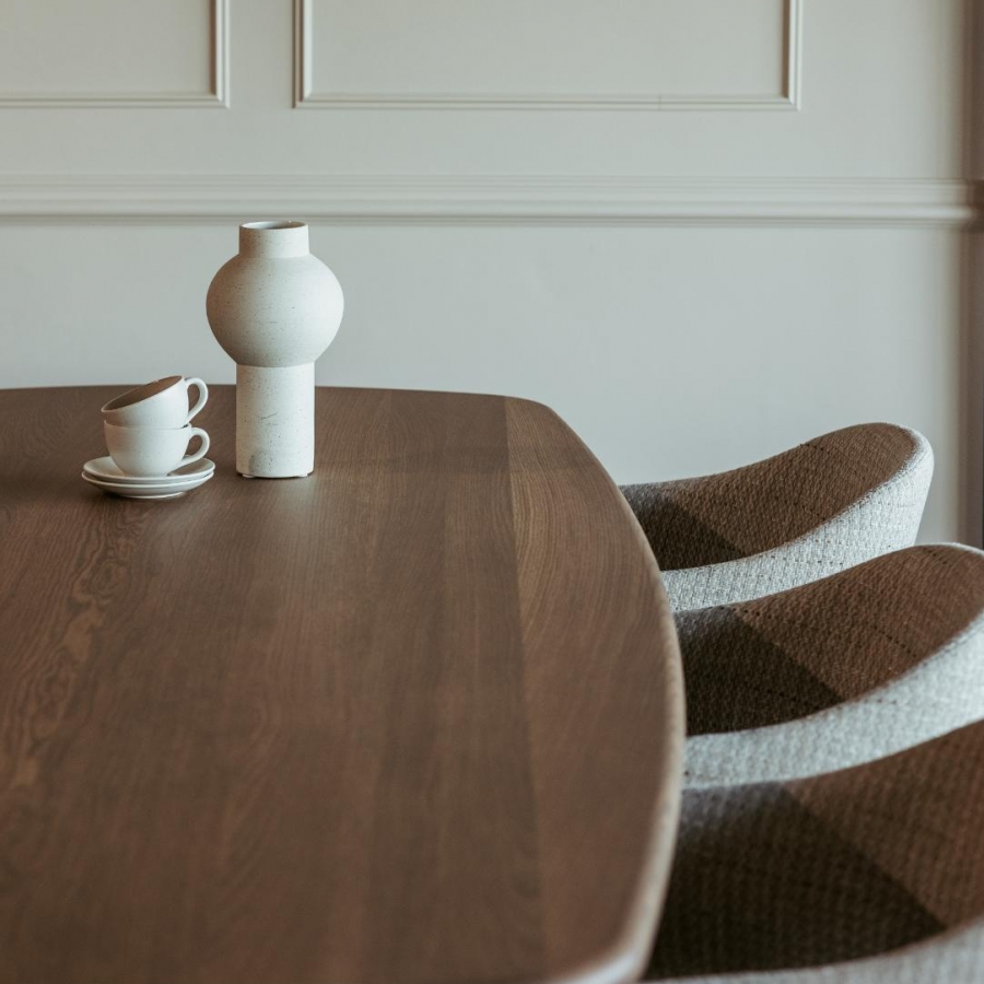 De massieve poten zijn de eye-catcher van deze tafel. Ze staan verdeeld onder het tafelblad. De poten zijn aan de zijkanten ook volledig rond afgewerkt zodat dit mooi matcht met de randafwerking van het tafelblad. Doordat de poten wat verder onder het tafelblad zijn geplaatst, kun je ook gebruikmaken van de kopse kanten.