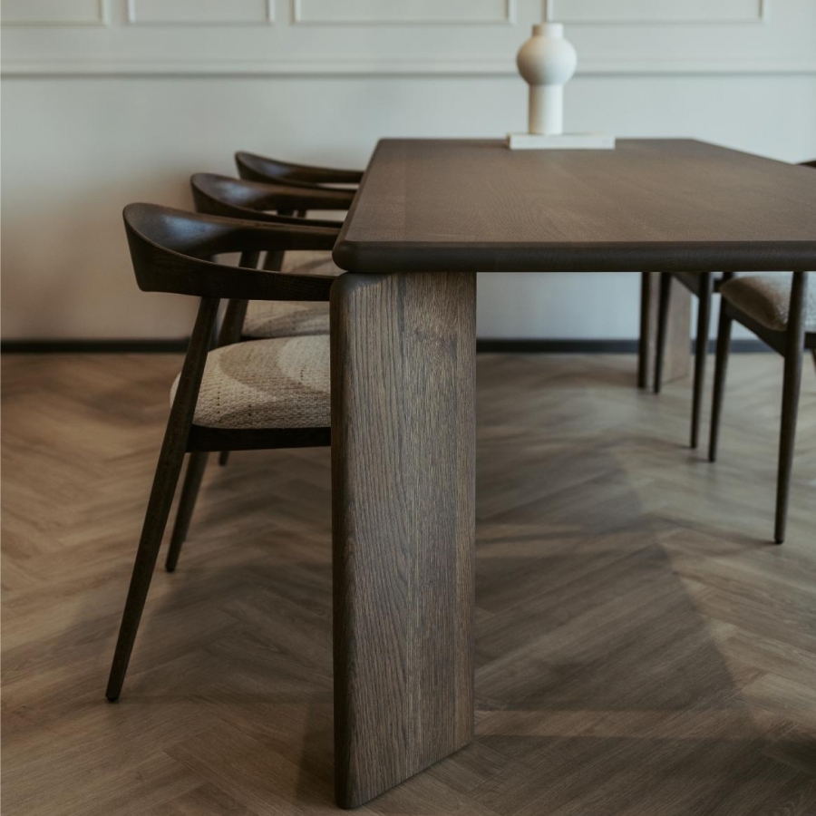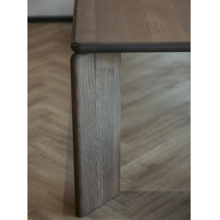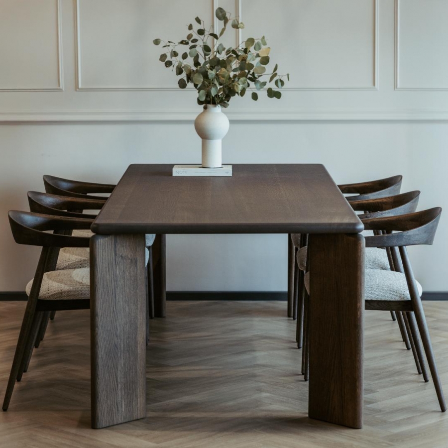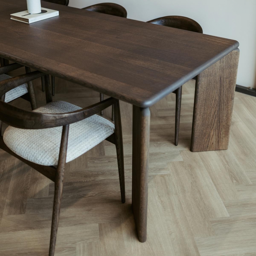 Rechte tafel van eiken met een ronde randafwerking uitgevoerd met vier massief houten poten met ronde randafwerking in de kleur 'zwartbruin'.