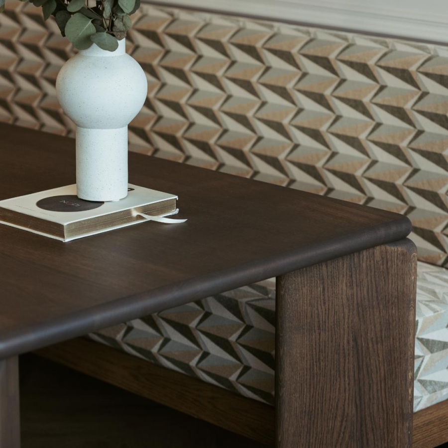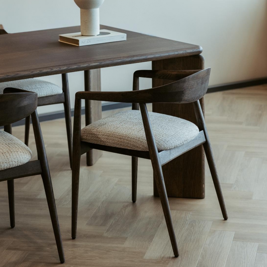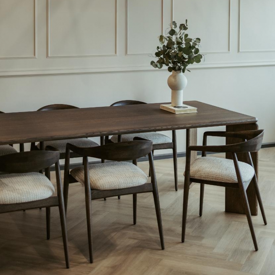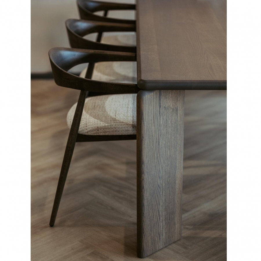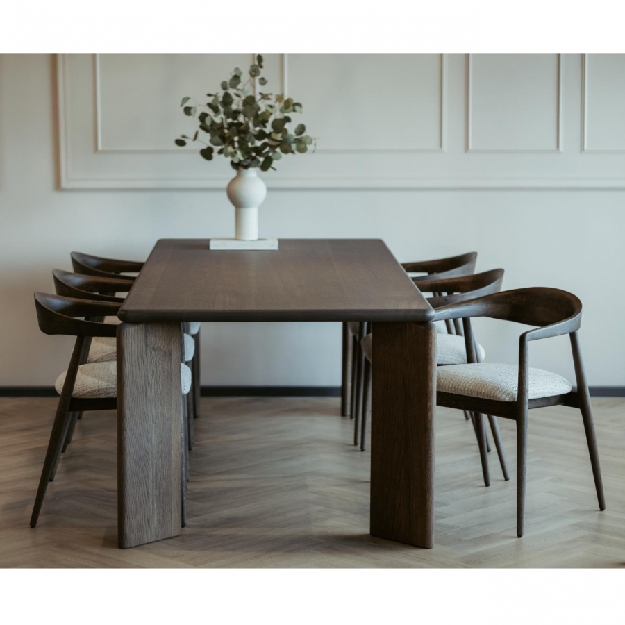 Rechte tafel van eiken met een ronde randafwerking uitgevoerd met vier massief houten poten met ronde randafwerking in de kleur 'zwartbruin'.