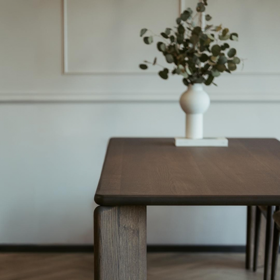 De tafels van Lijn M worden altijd stevig en degelijk afgeleverd. Wij houden rekening met de zaken die hiervoor zorgdragen. Het hout dat gebruikt wordt is gecontroleerd en langdurig gedroogd in droogkamers en computergestuurd gecontroleerd op vochtigheidsgraad. Wij schaven de planken zelf terug van een fijnbezaagd naar volledig vlak materiaal en zorgen dat de naden spik en span, naadloos in elkaar overgaan. De planken worden op deze manier niet onder druk verlijmd en zullen nooit gaan werken op de naden tussen de planken.