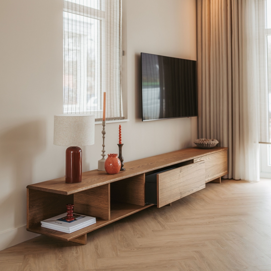 De combinatie van gesloten lades en open vakken maakt dit TV-meubel niet alleen stijlvol, maar ook bijzonder praktisch. In de lades berg je moeiteloos afstandsbedieningen, kabels en accessoires uit het zicht op, terwijl de open vakken ruimte bieden voor decoratie. Dit zorgt voor een perfecte balans tussen opgeruimd wonen en persoonlijkheid.