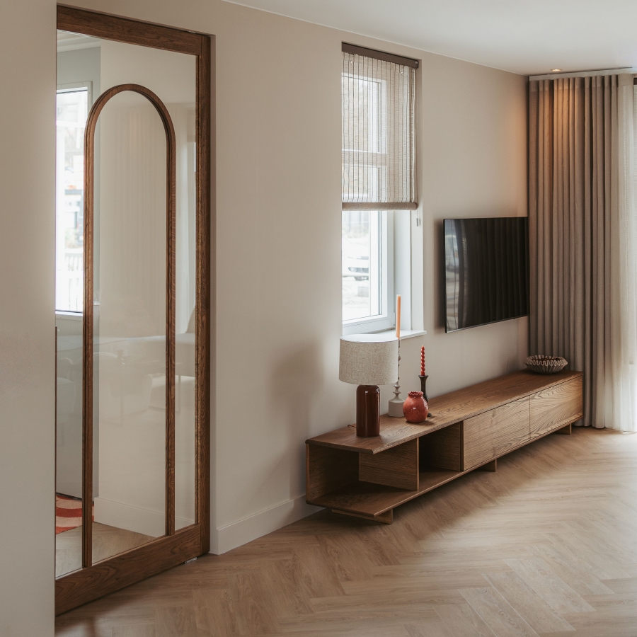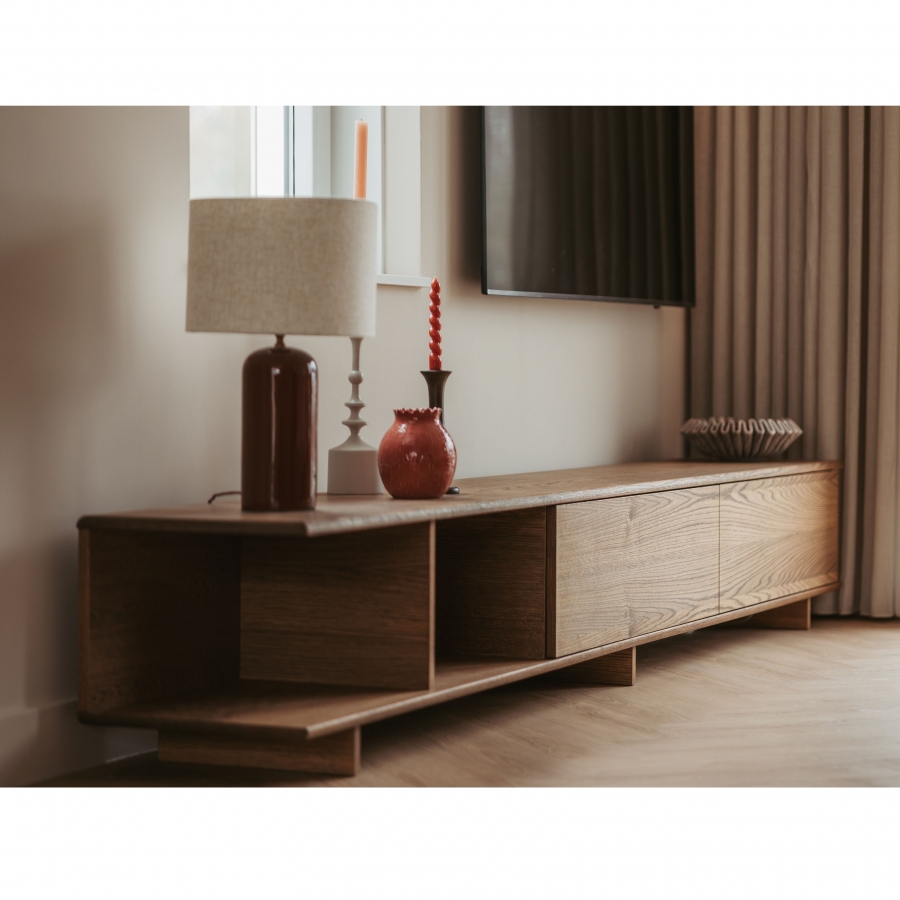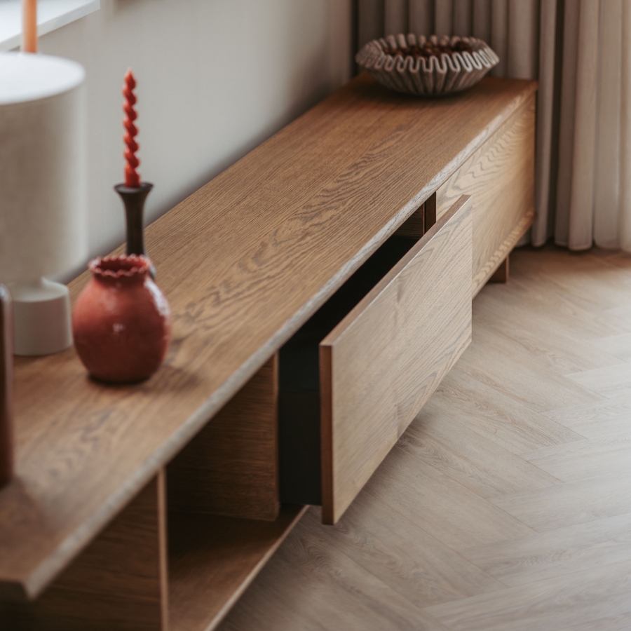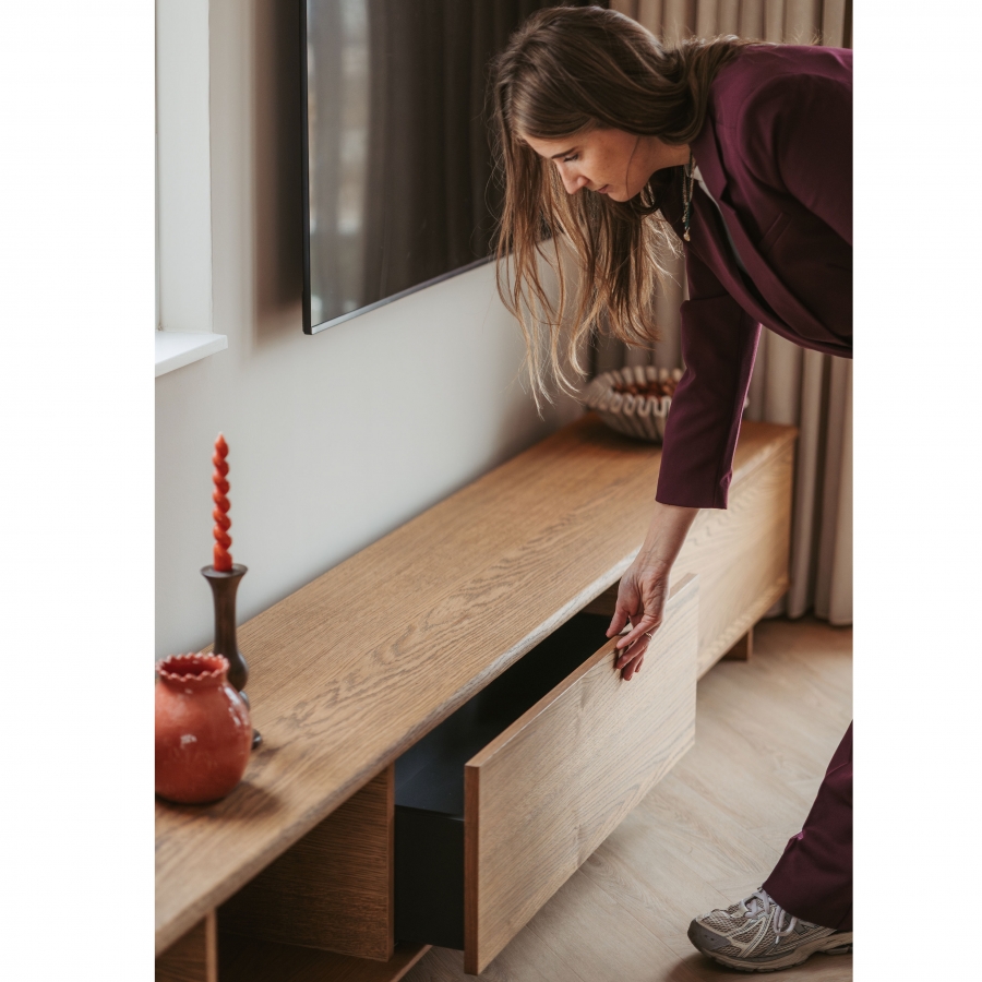 Dankzij het open onderstel en het horizontale lijnenspel oogt het meubel licht en luchtig, ondanks zijn solide eiken constructie. Het lage ontwerp versterkt het gevoel van ruimte en draagt bij aan de serene, minimalistische uitstraling die zo kenmerkend is voor de Japandi stijl.