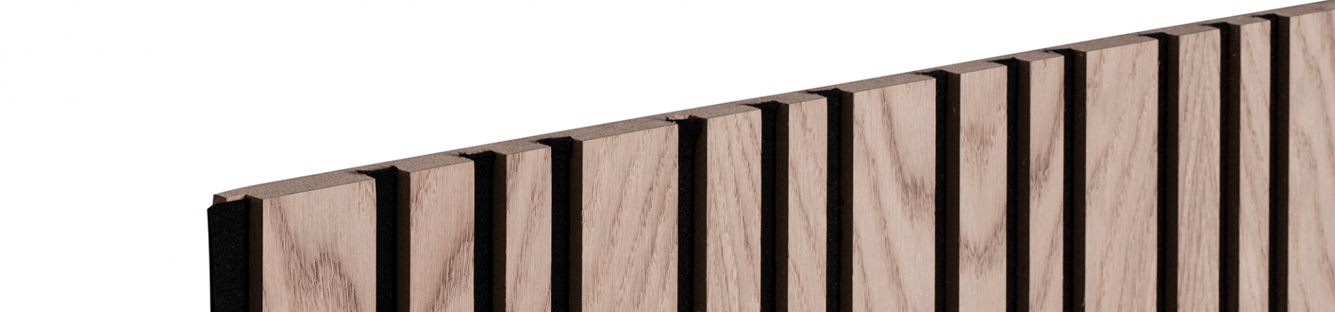 Een paneel heeft altijd aan één kant een ‘mes’ randje en aan de andere kant een strookje overstekend vilt. Op deze manier kun je de panelen naadloos op elkaar aansluiten. Wanneer je vanaf de zijkant tegen een paneel aankijkt, zie je het kale MDF. Voor een mooie afwerking gebruik je dan een eindlat. Deze latten hebben een gefineerde zijkant en zorgen voor een mooie afwerking.